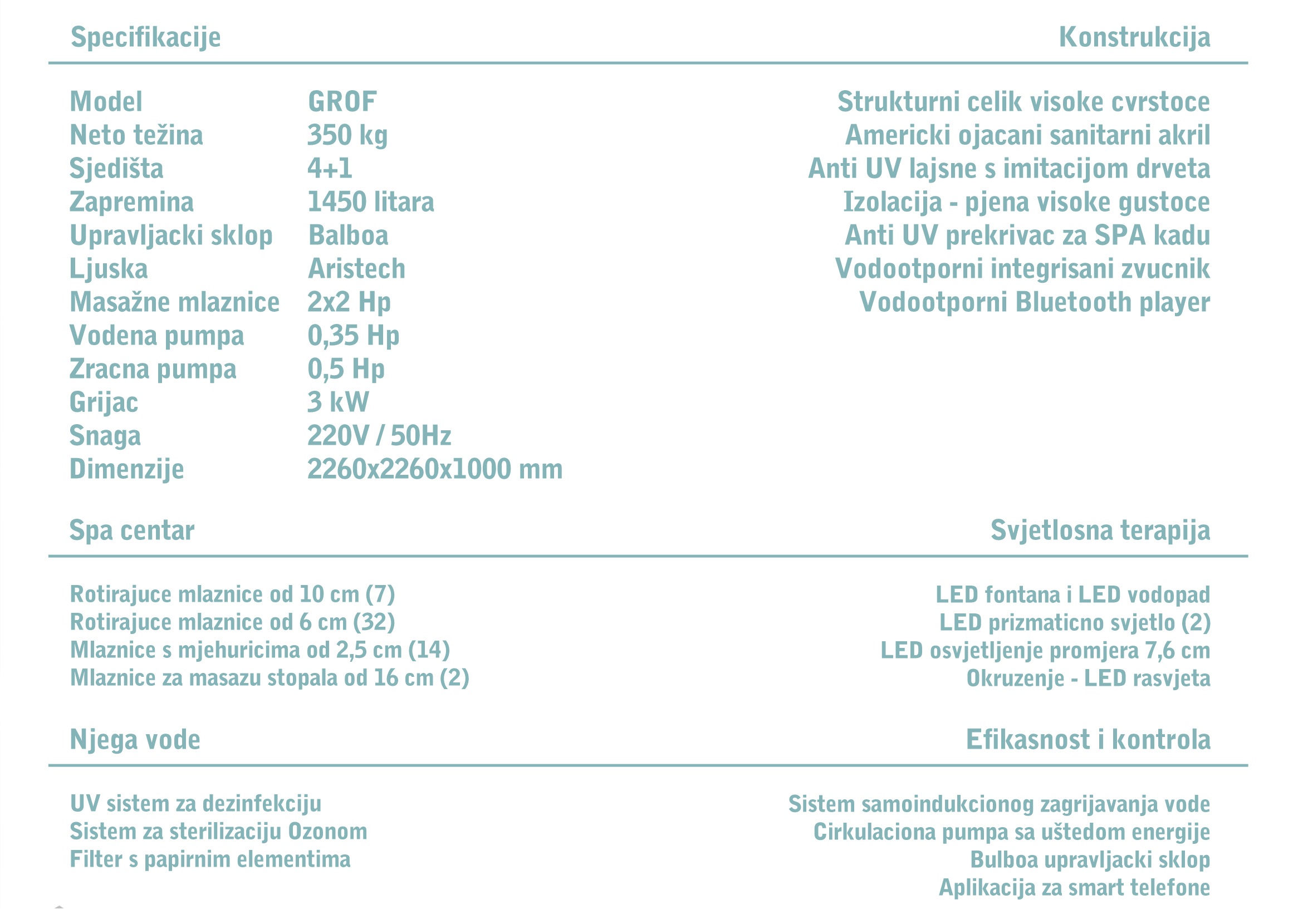 Sofisticirani hidro-masažni i aero-masažni sistemi raspoređeni su tako da ciljano opuštaju ključne tačke mišića, poboljšavaju cirkulaciju i smanjuju napetost nakupljenu tokom dana. Uz to, tihi rad pumpi i pažljivo odabrana ergonomija unutrašnjeg prostora obezbjeđuju potpuno novu dimenziju kućnog spa doživljaja.